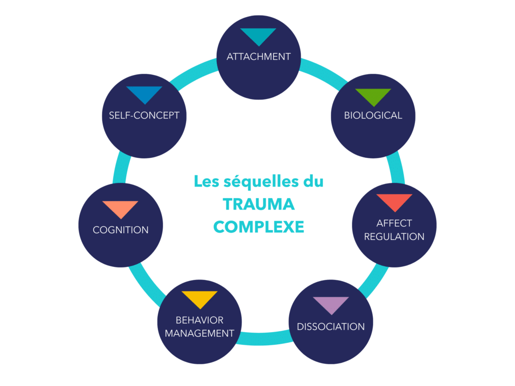 The impact of complex trauma is reflected in a variety of after-effects, including attachment, biology, affect regulation, dissociation, behaviour management, cognition, and self-concept (Cook et al., 2003; Milot et al., 2013).